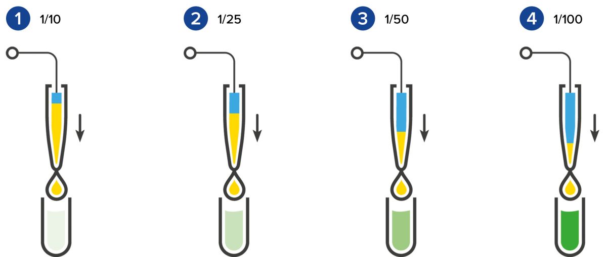 Die Liquid-Station Software ermöglicht es Ihnen die Proben mit unterschiedlichen Faktoren und Endvolumen zu verdünnen. Ein und dieselbe Probe kann auch mit unterschiedlichen Parametern verdünnt werden, sodass auch Verdünnungsreihen durchgeführt werden können.