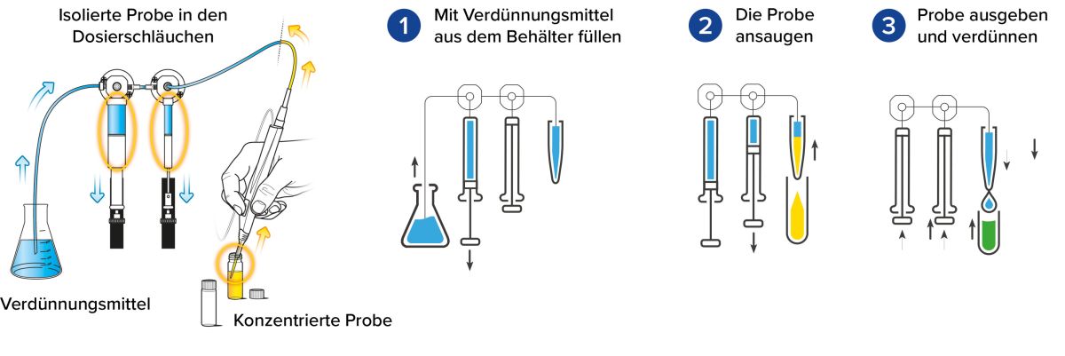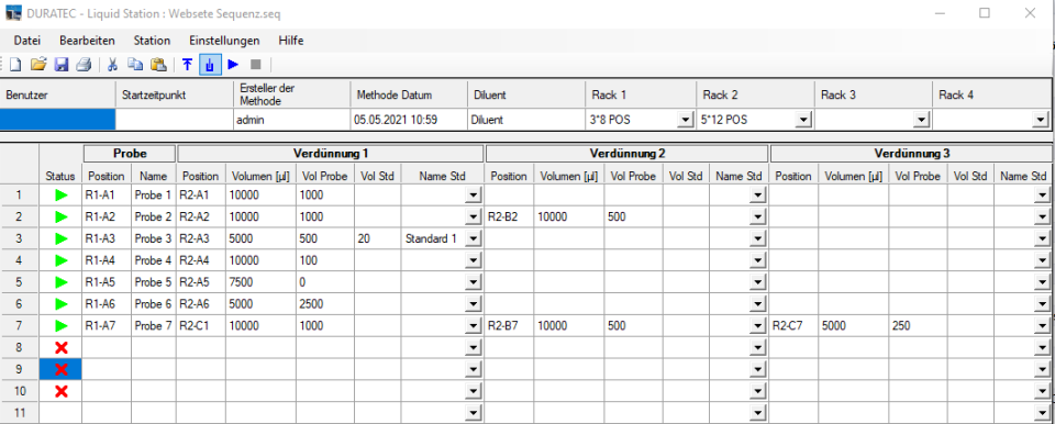 In der Sequenztabelle der Software werden die unterschiedlichen Verdünnungen mit Angabe des Vorlagegefäßes (Probe) und Zielgefäßes (Verdünnung) eingegeben. Die jeweilige Sequenztabelle kann abgespeichert und für neue Verdünnungen wieder geladen werden. Nach dem Starten einer Sequenz werden die Verdünnungen automatisch ausgeführt.