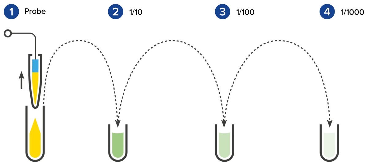| Mischen | Durch das Einstrahlen der Probe und des Verdünnungsmediums in das leere Zielgefäß erfolgt bereits eine erste Durchmischung. Sollte dies noch nicht ausreichen, kann die Probe über die noch eingetauchte Probennadel durch wiederholtes Aufsaugen und Abgeben eines Teilvolumens weiter gemischt werden. |