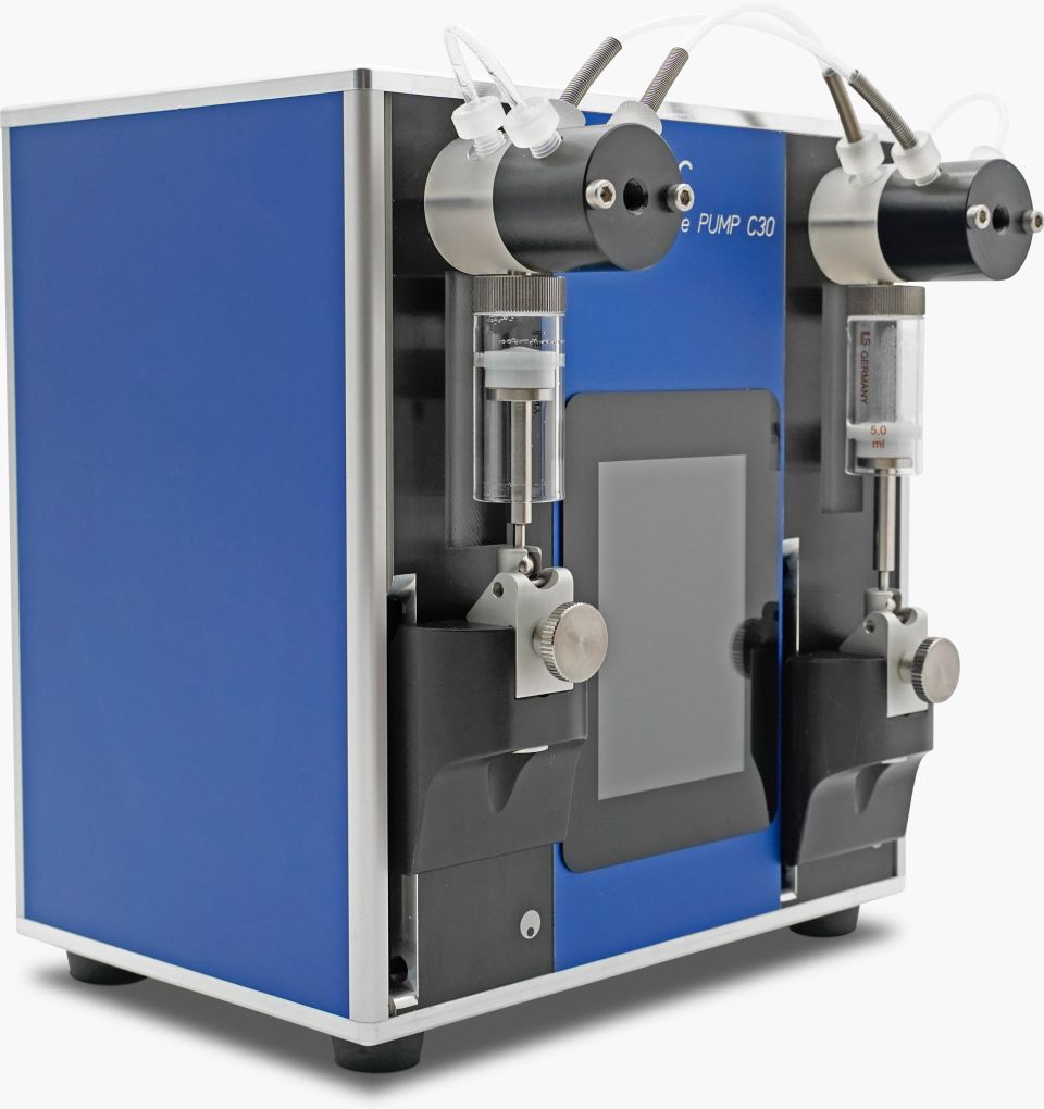 The flow rates cover – depending on assembled syringe - a range from 0.04μl/min to 300ml/min. Besides continuous flow also finite dosing is realizable. Control and monitoring of the pump can be ensured by RS232, Bluetooth as well as by analogue or TLL-signals.